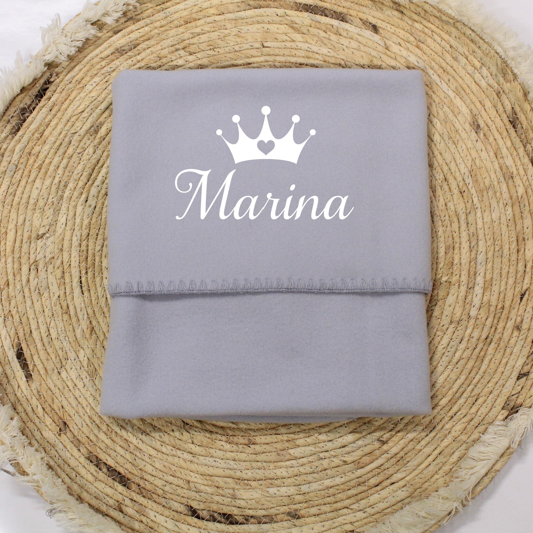 Dekentje wordt voorzien van naam en hartjes kroon gedrukt in een kleur naar keuze.