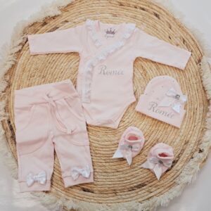 Dit licht roze geboortepakje met naam is een luxe en zacht roze newborn setje van 100% katoen