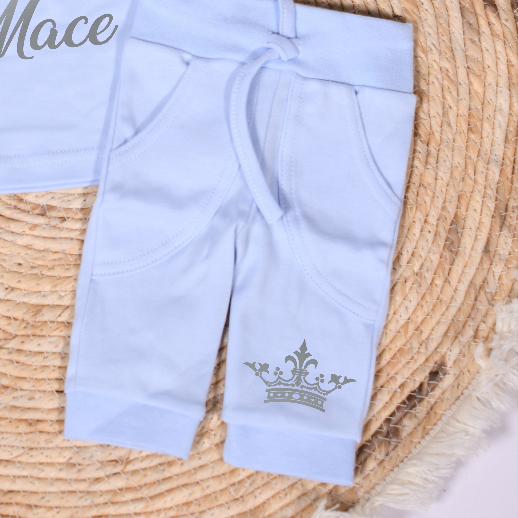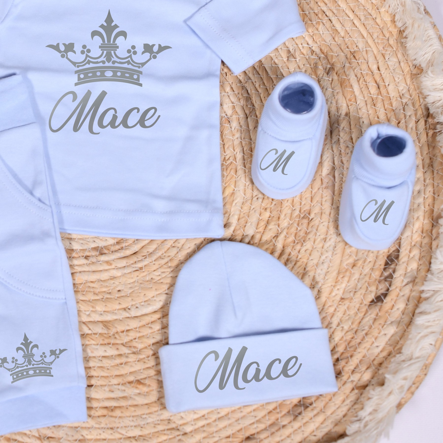 Schattig geboorte setje in licht blauw,zand, wit of zwart. Naam en kroon worden in kleur naar keuze gedrukt