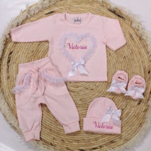 Dit leuke en unieke licht roze geboorte setje is voorzien van een hart in wit kant. Het setje is afgewerkt met witte strikken. Haar naam wordt gedrukt in een kleur naar keuze.