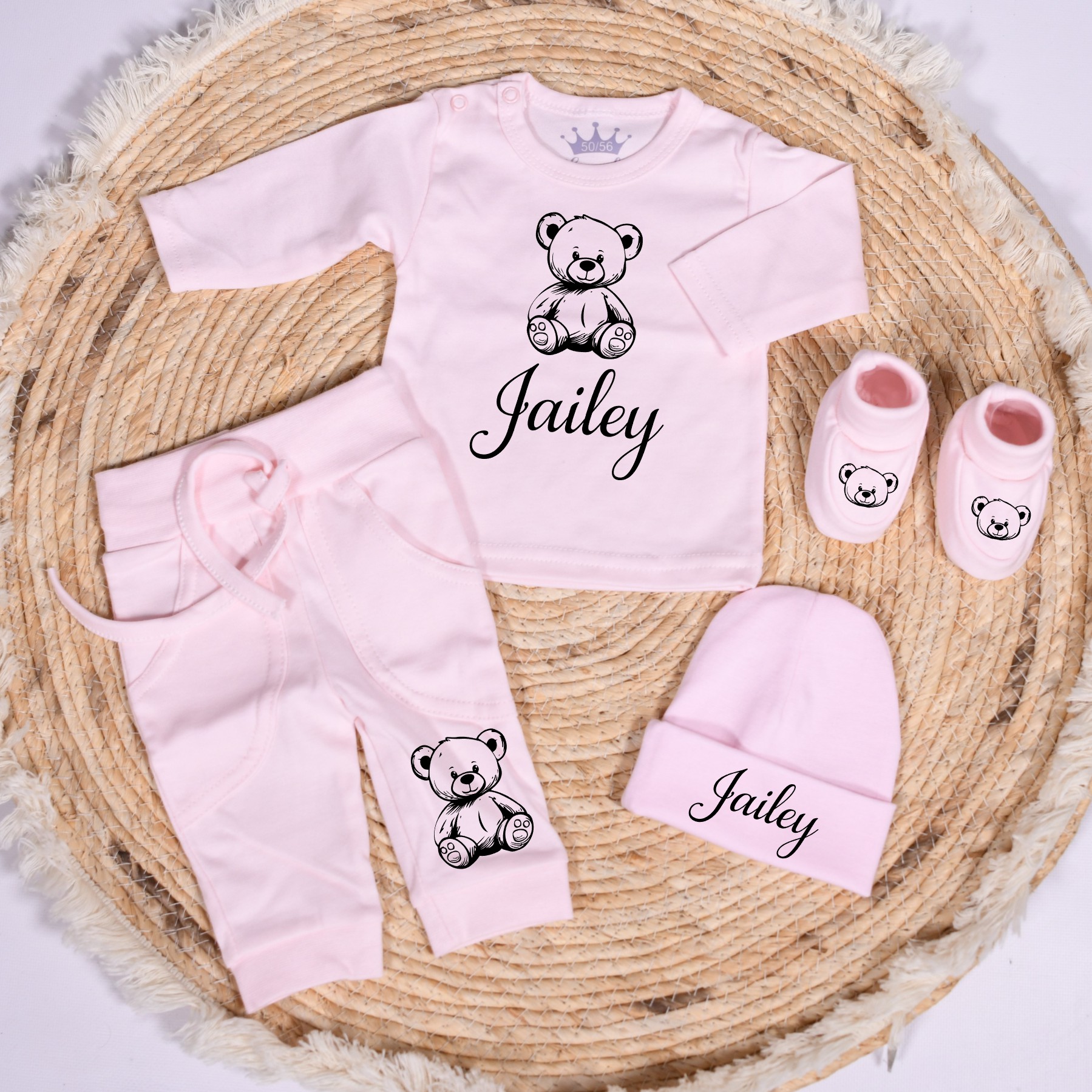Schattig geboorte setje in licht roze, wit of zwart. Naam en beertje worden in kleur naar keuze gedrukt