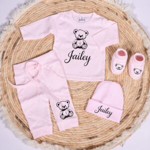 Een super schattige geboorte pakje met naam en beertje gedrukt in kleur naar keuze.