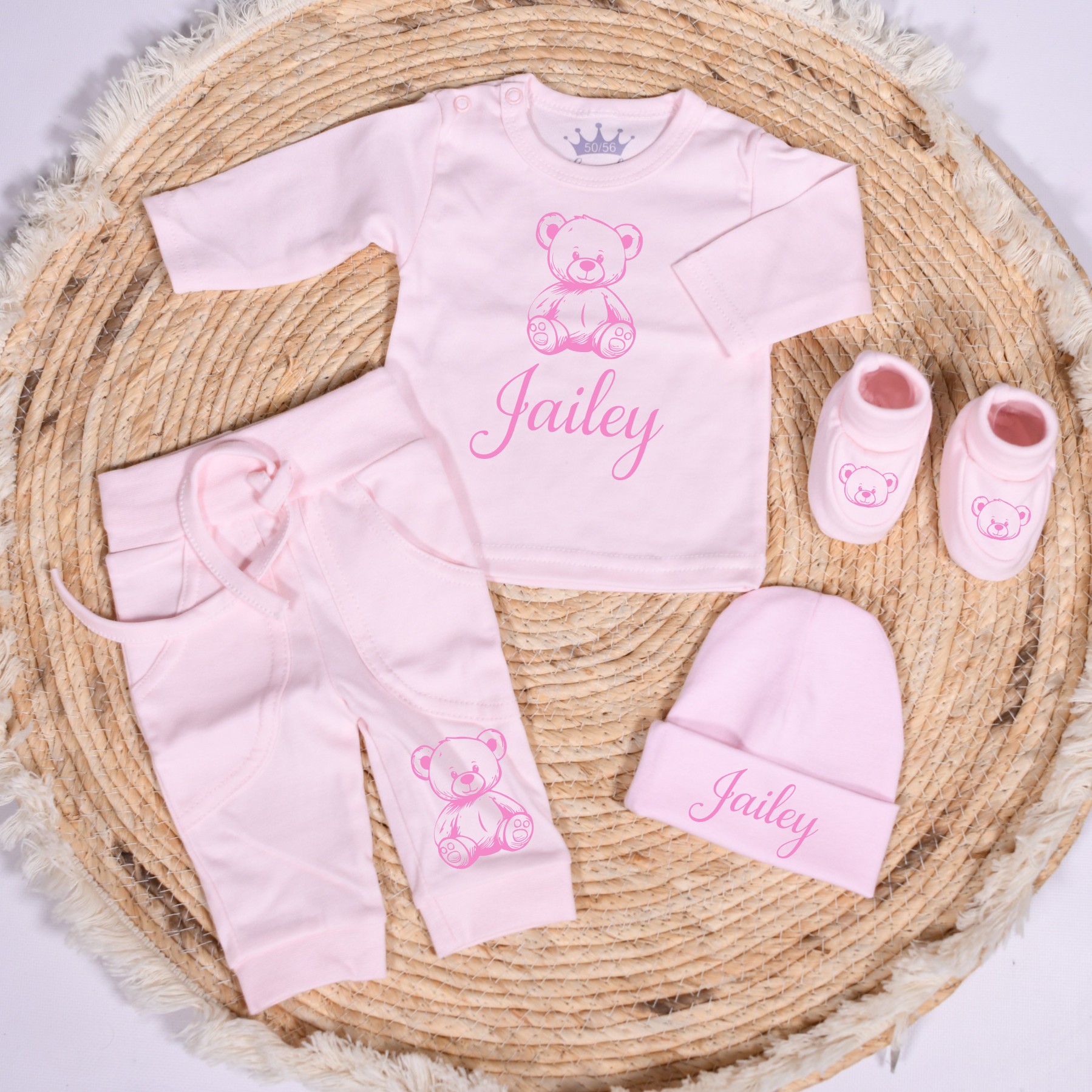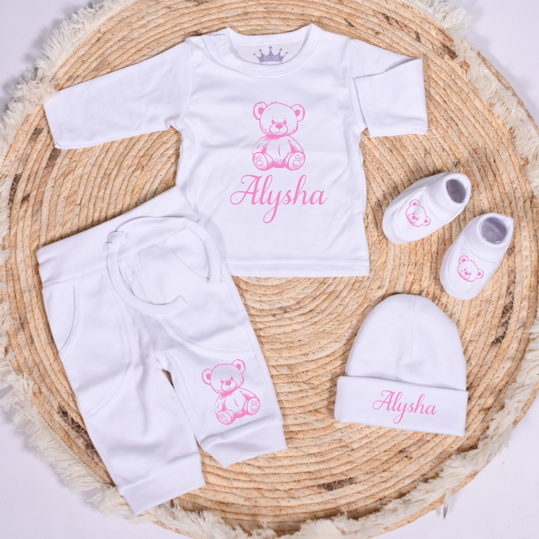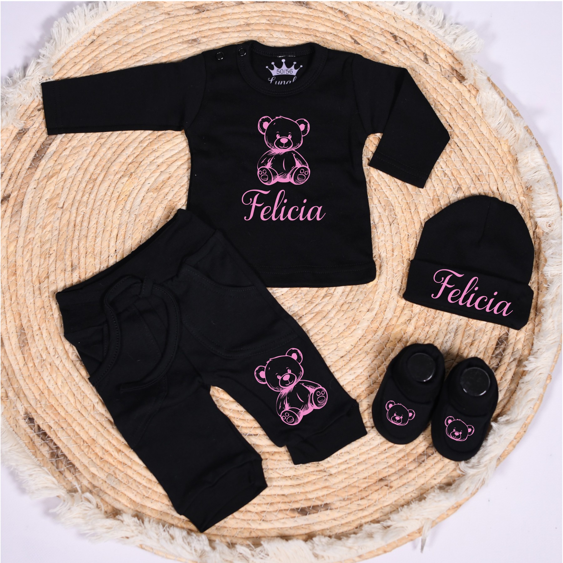 Schattig geboorte setje in licht roze, wit of zwart. Naam en beertje worden in kleur naar keuze gedrukt