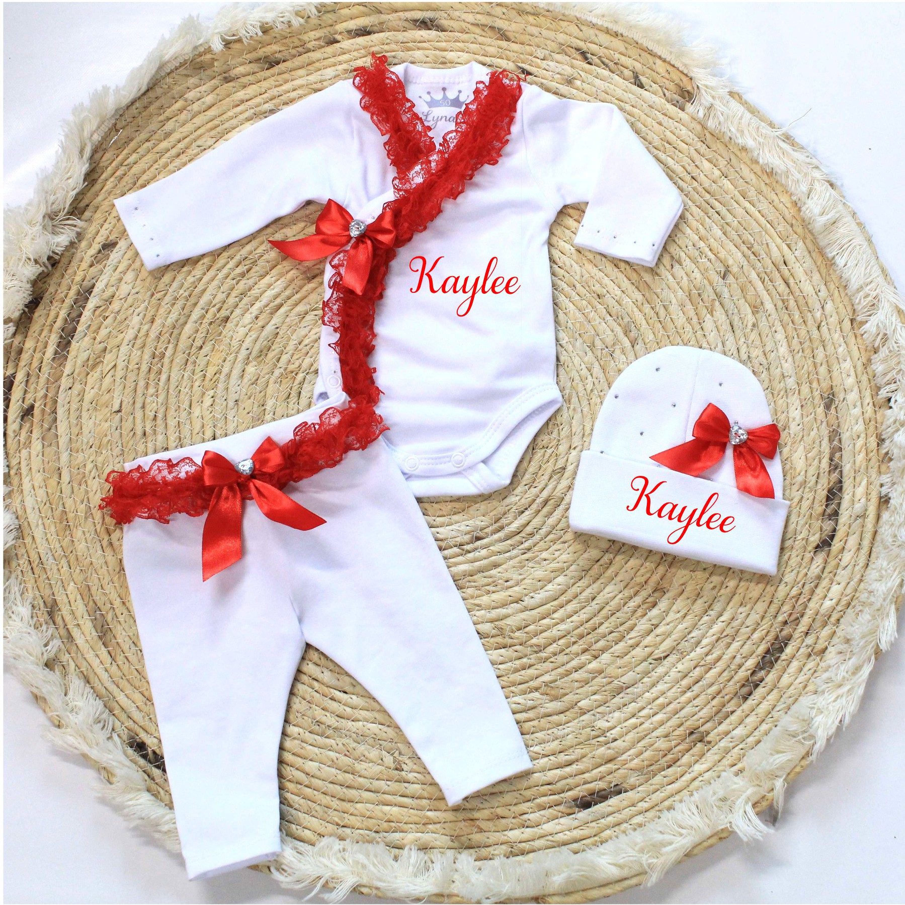 Dit leuke en unieke Geboorte setje is voorzien van een rood kantje. Het setje is afgewerkt met crystal kleurige strass steentjes en rode strikken. haar naam wordt gedrukt in een kleur naar keuze