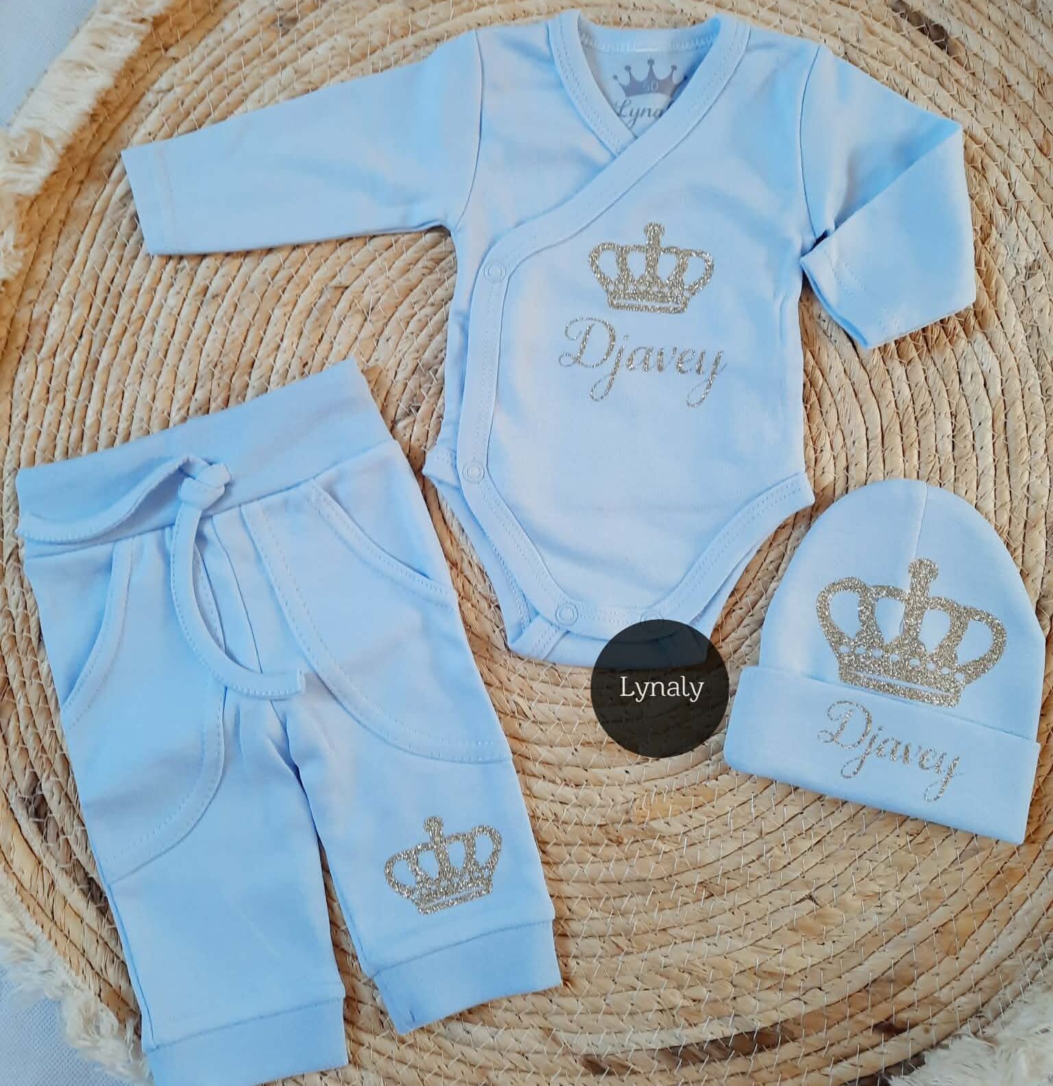 Dit lieve newborn setje is perfect als eerste pakje voor je baby of als persoonlijk kraamcadeau met naam en kroontje.