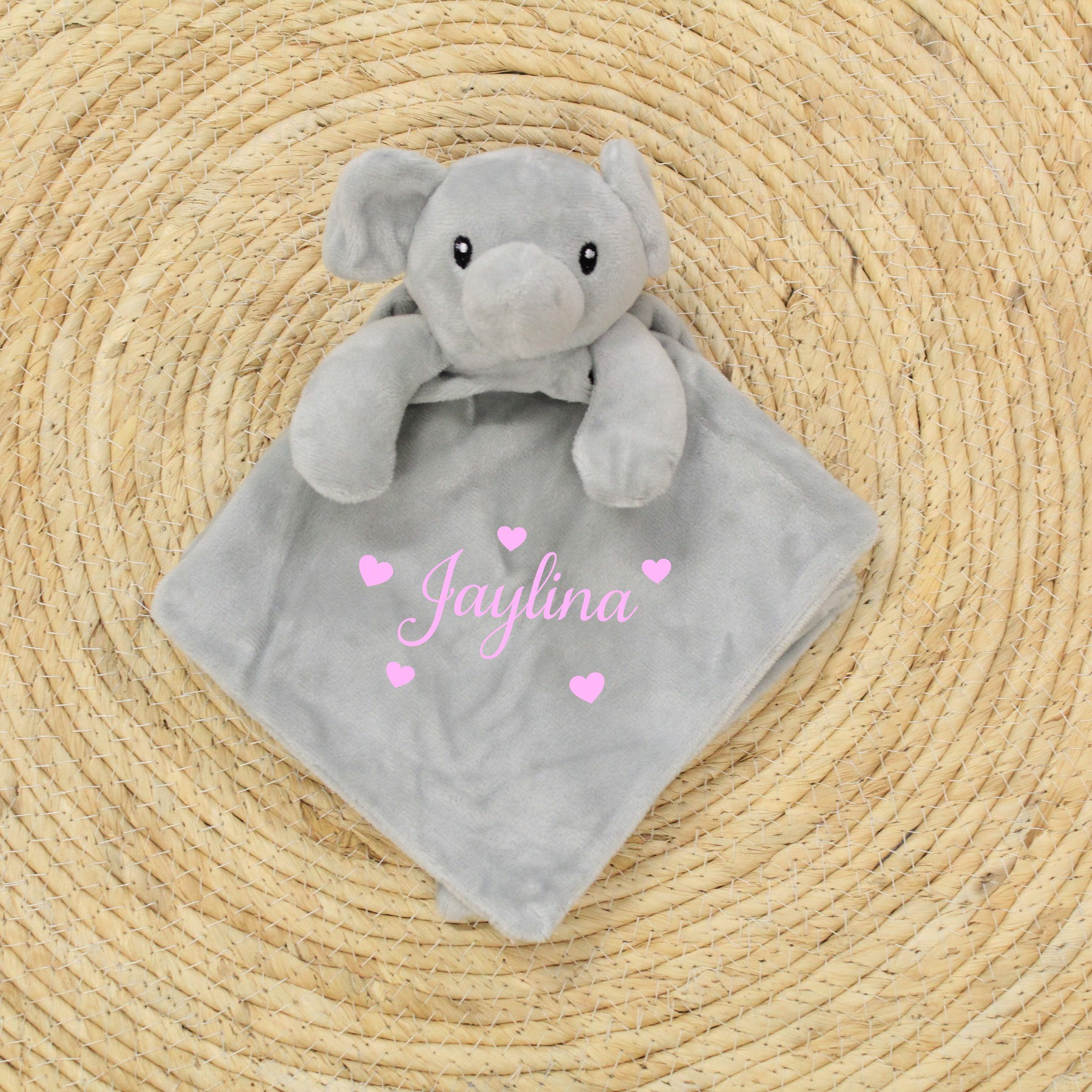Een heerlijk zacht knuffeldoekje in roze of blauw, gedrukt met naam en hartjes in kleur naar keuze.