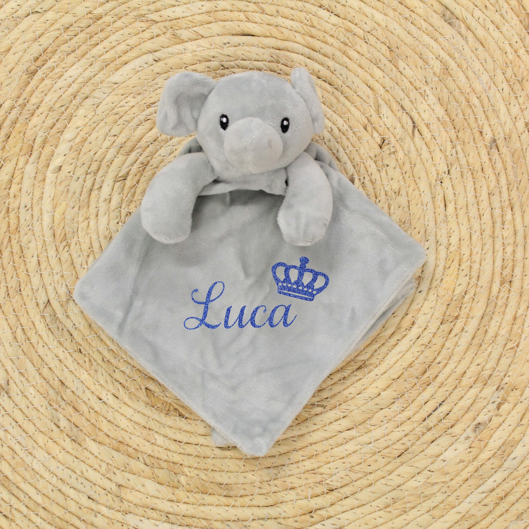 Het knuffeldoekje is er in blauw of roze. En wordt gedrukt met naam en kroontje in kleur naar keuze.