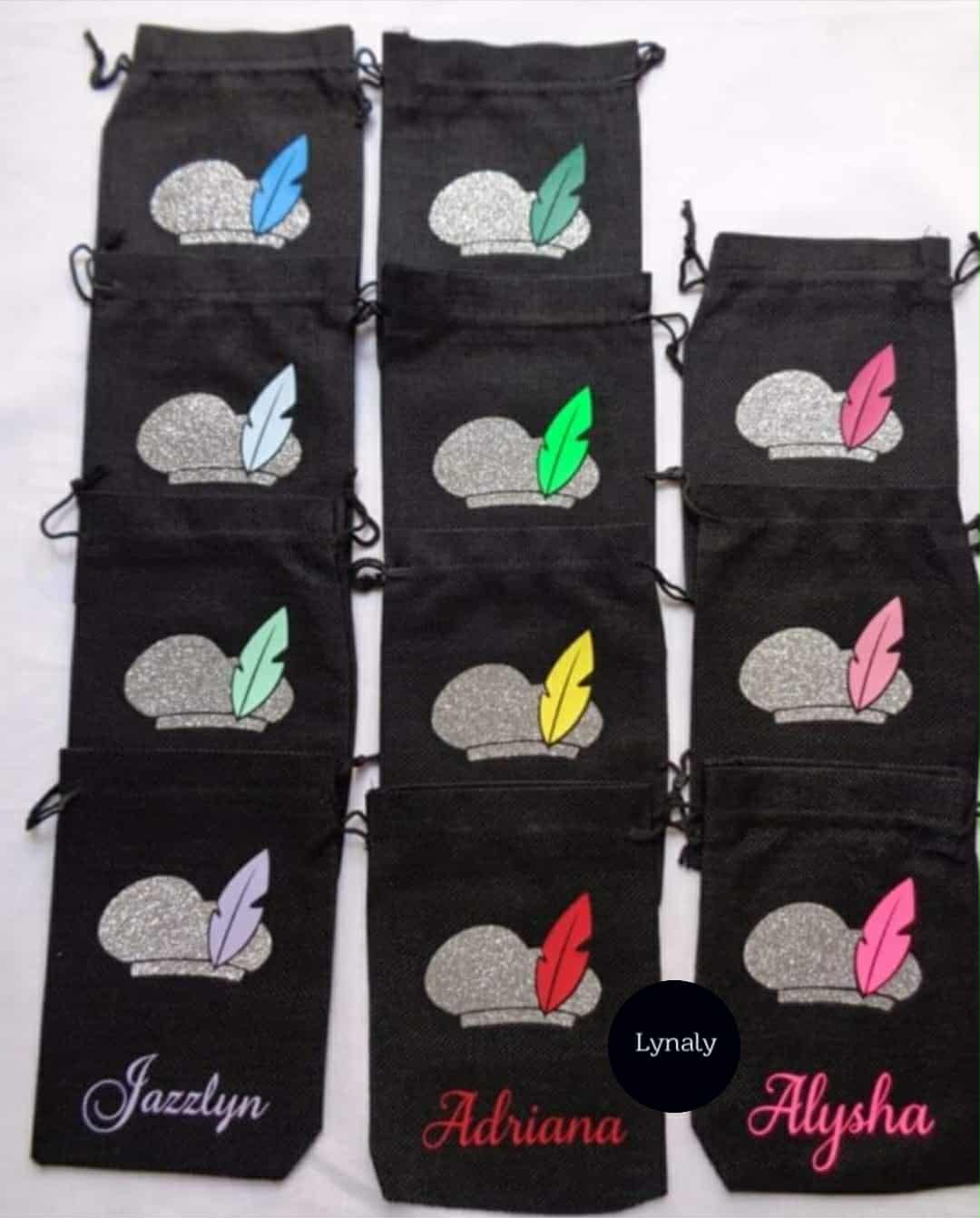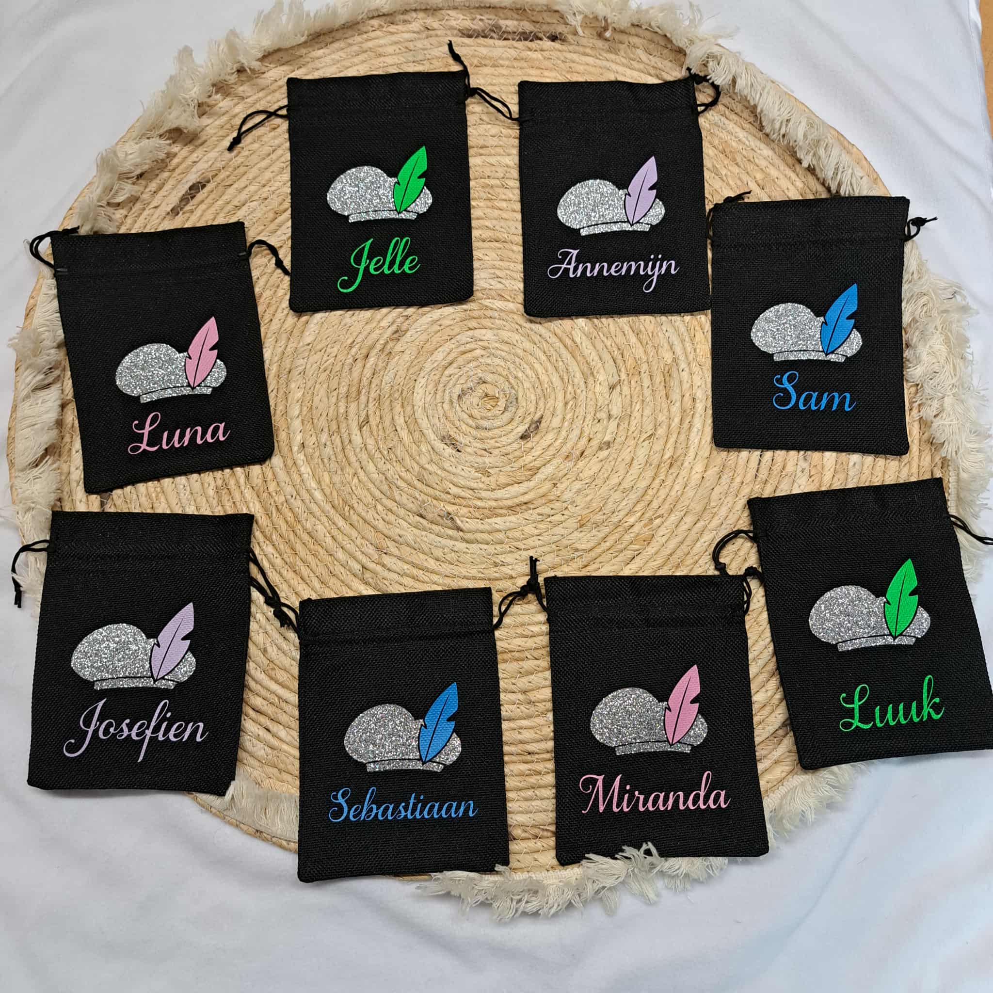 Zakje wordt voorzien van een glitter zilveren muts, met naam en veer in kleur naar keuze gedrukt.