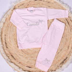 Een schattige pyjama met de opdruk naam en strikje gedrukt in kleur naar keuze.