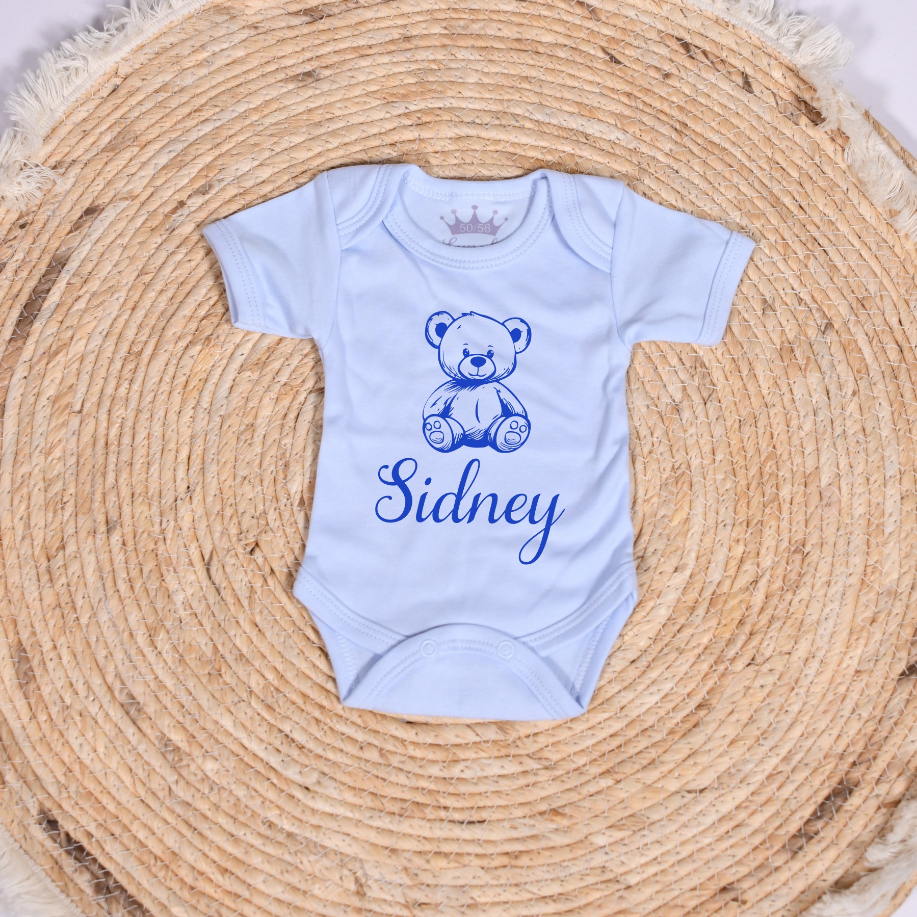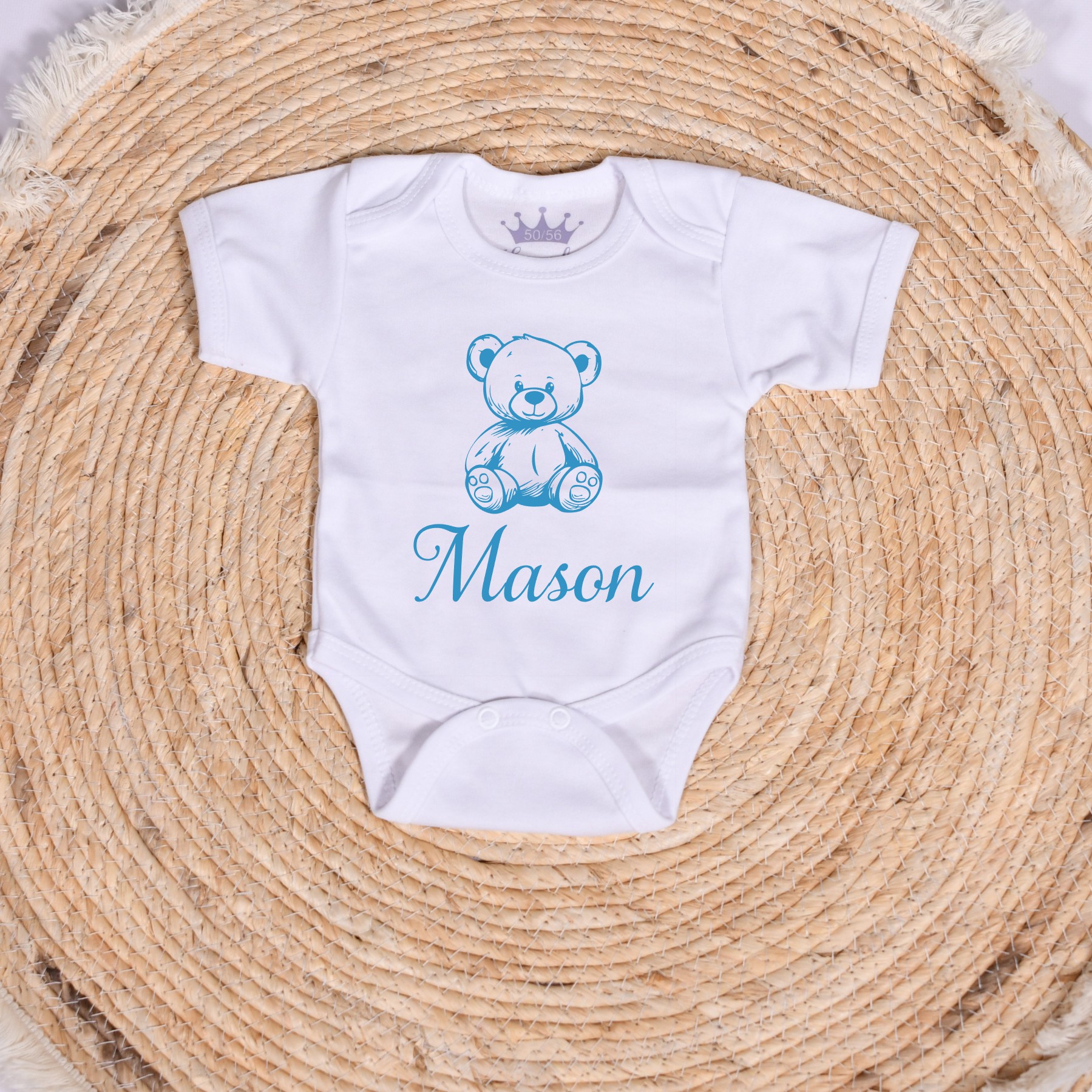 Rompertje in de kleur wit, blauw, roze of zwart met beertje en naam gedrukt in kleur naar keuze.