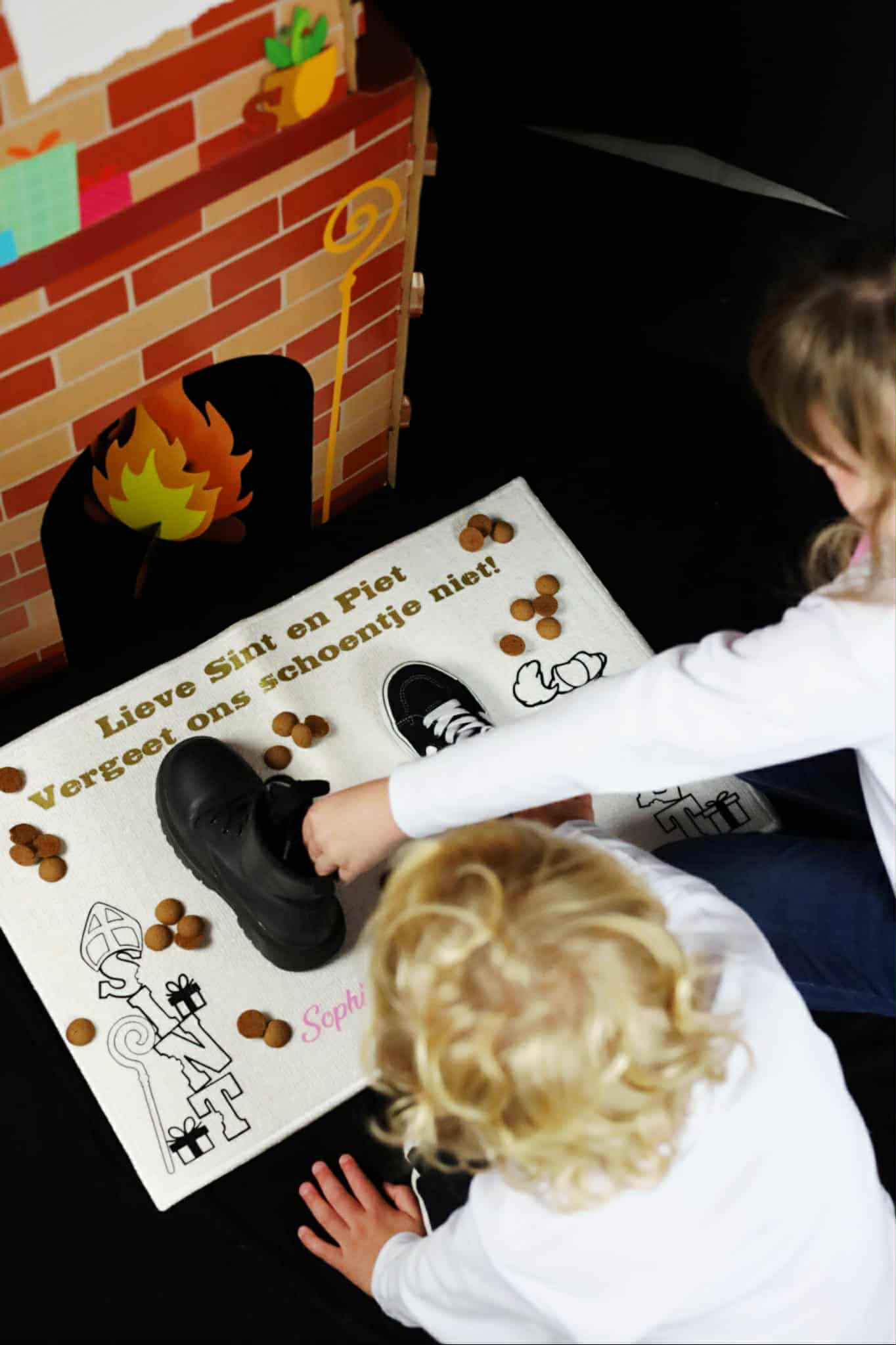 Schoentje zetten wordt nog leuker met deze schoenzet mat. De mat wordt voorzien van schoentjes in roze of blauw en daaronder de naam van je kindje
