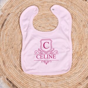 Een schattige slabbetje met naam en schild gedrukt in kleur naar keuze.